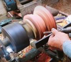 Whilst the workpiece is rotating clockwise, the operative removes material with a gouge. This method is used to make items like bedside lamp bases, chair legs and flower holders.